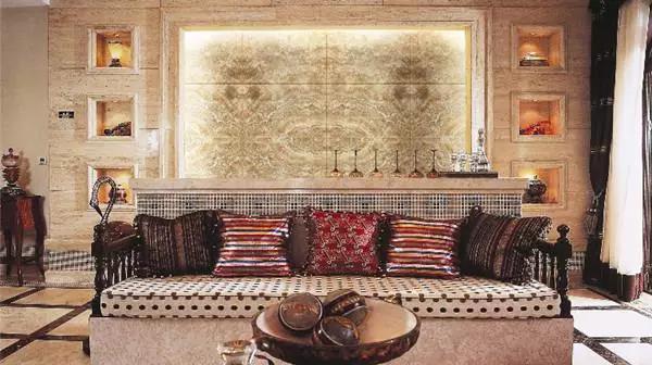 金啡洞產(chǎn)品紋理以金黃色漸變?yōu)樘厣瑢傧∮械V產(chǎn)資源大理石品種,凹凸小坑手感細(xì)膩,立體的視覺(jué)震撼,使得整個(gè)空間充滿著強(qiáng)烈的文化和歷史韻味。
