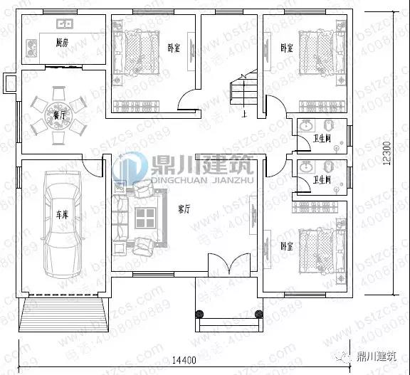 一 層: 客廳、臥室(附衛(wèi)生間)、2臥室、廚房、餐廳、衛(wèi)生間、車庫