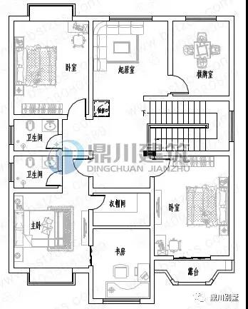 二 層: 小客廳、臥室(附衛(wèi)生間)、2臥室、書房(或臥室)、衛(wèi)生間、陽臺(tái)