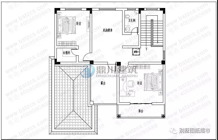 三層設(shè)健身廳、臥室(附衣帽間)、臥室(附陽(yáng)臺(tái))、衛(wèi)生間、露臺(tái),如果家里人不喜歡健身,可以改成棋牌室或者娛樂房,一家人其樂融融。