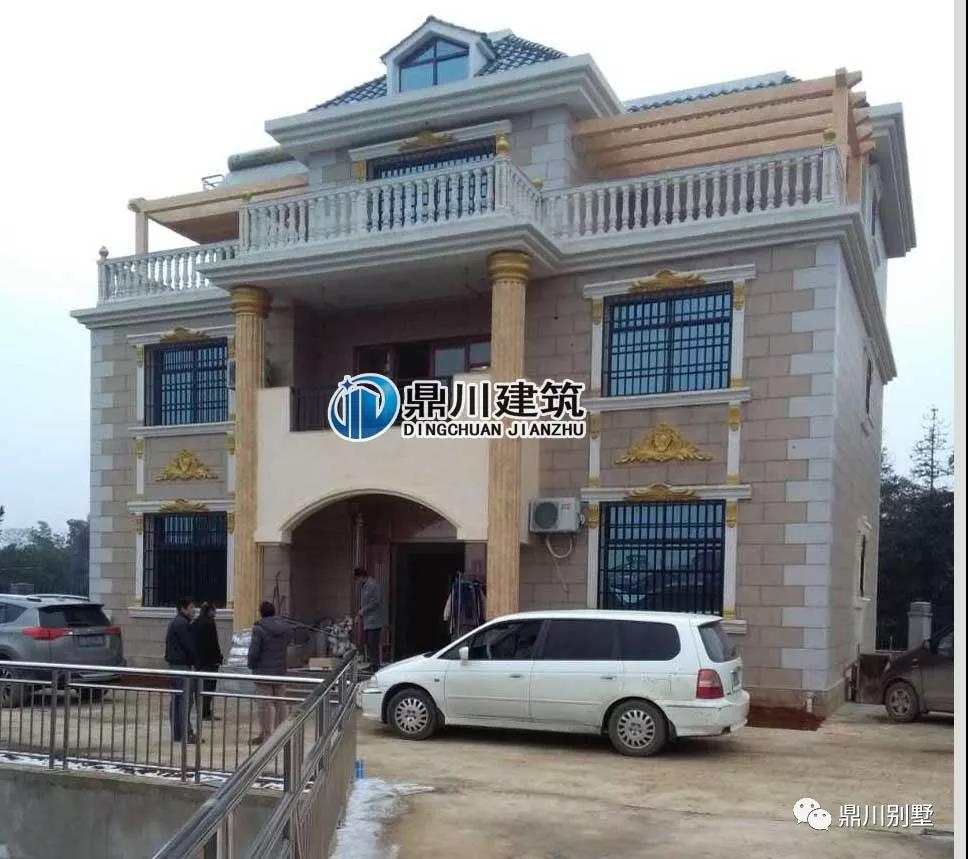 第二款案例,在造型上做了稍微的調(diào)整,三層的二個相鄰的窗戶改成了一個,左右的露臺分別設(shè)置了一個露臺架。金色的羅馬柱和金色的山花貴氣又大方。