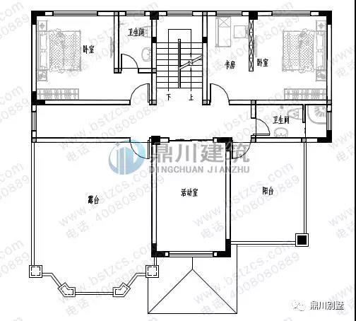 三 層:活動室、臥室(附衛(wèi)生間)、臥室(附書房)、衛(wèi)生間、陽臺、露臺