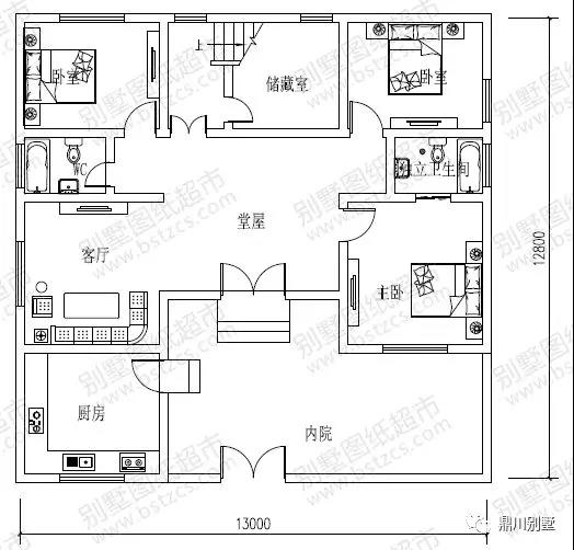 一 層: 內(nèi)院、堂屋、客廳、臥室(附衛(wèi)生間)、2臥室、廚房、儲(chǔ)藏室、衛(wèi)生間