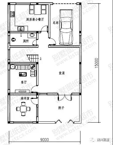 一 層: 院子、麻將室、堂屋、客廳、廚房兼餐廳、衛(wèi)生間、車(chē)庫(kù)