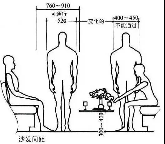 當兩組沙發(fā)相對放置時,尺寸的問題要非常小心,不然到時候直接讓你懷疑人生。當沙發(fā)上坐人時,其他人若能正常通行,那么茶幾與沙發(fā)較為適宜的距離為760-910mm。