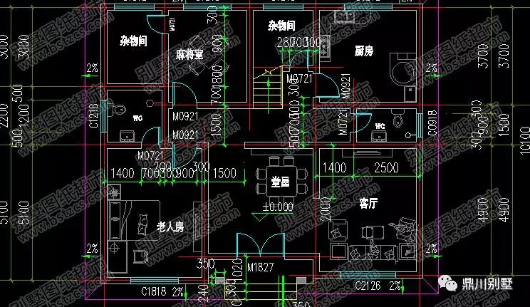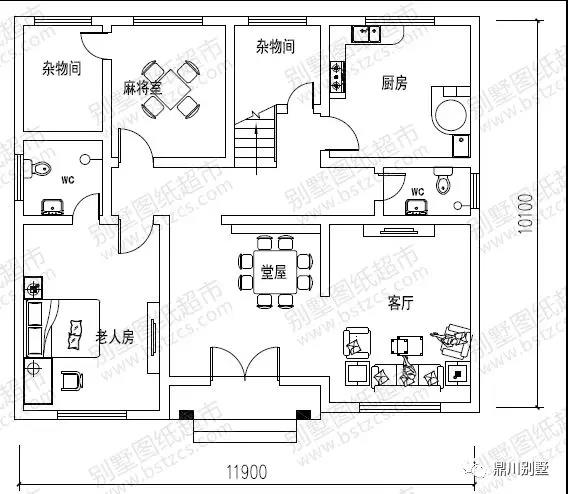 一 層: 堂屋、客廳、老人房(附衛(wèi)生間)、麻將室(附雜物間)、雜物間、廚房(兼餐廳)、衛(wèi)生間