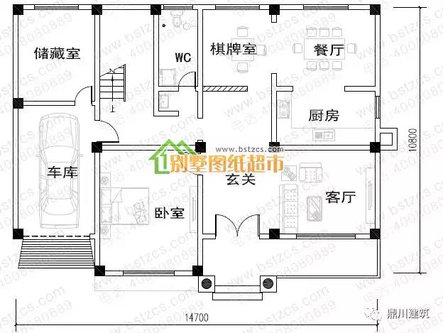 一 層:客廳、臥室、棋牌室、廚房、餐廳、衛(wèi)生間、儲藏室、車庫