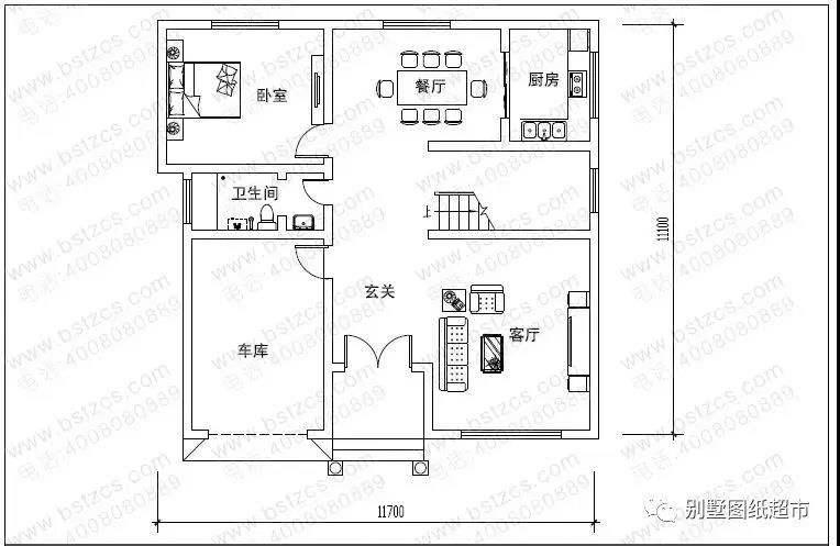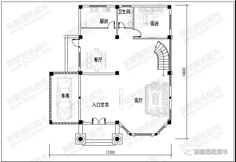 一 層:入口玄關(guān)、客廳、餐廳、廚房、客房、衛(wèi)生間、車庫