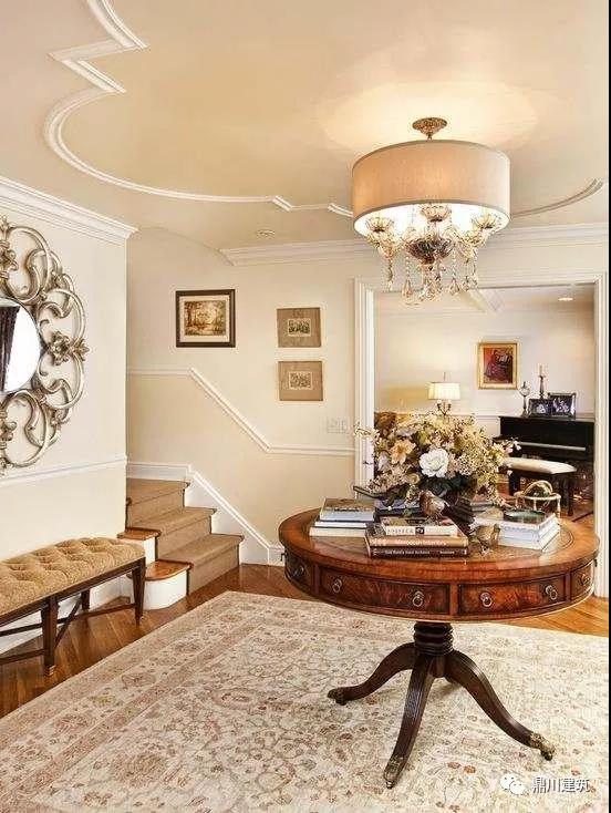如果家里層高不夠,裝石膏線反而會有種拔高之感,另外簡潔的線條看上去十分大氣。層高較高的也可以裝石膏線,像圖中這樣做在吊燈周圍,既讓天花板看上去不單調(diào),又典雅大氣。