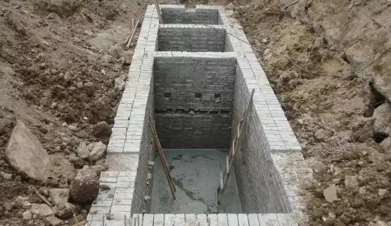 3、撒上石灰線,放線時(shí)留出磚砌,然后按線挖坑,開(kāi)挖池坑時(shí),對(duì)土質(zhì)較好的地塊,宜采用直接開(kāi)挖,使磚塊緊貼坑壁砌筑;對(duì)土質(zhì)差或有地下水的地塊,只好采用按一定坡度的放坡開(kāi)挖,并留不小于150mm的回填寬度,按化糞池的尺寸先砌好墻體,然后抹灰防水。