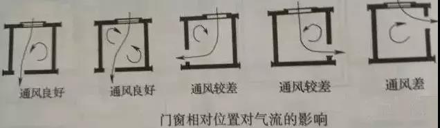 房間內(nèi)的通風(fēng)不止受門的位置影響,也受到窗戶的制約,為了達(dá)到優(yōu)良的通風(fēng)效果,門的位置應(yīng)盡量與窗相配合,可以形成穿堂風(fēng),加大通氣范圍。具體位置如下圖所示。
