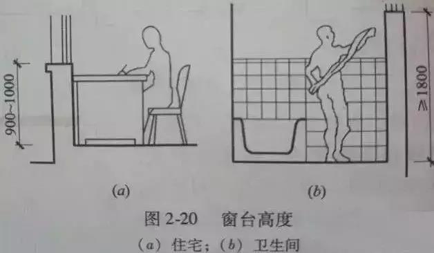 對于特殊位置的窗臺,如衛(wèi)生間、浴室以及房屋后窗,為了保證隱私,高度可以設(shè)置為1800mm。設(shè)火炕的農(nóng)村住宅,窗臺一般高于火炕200~300mm。