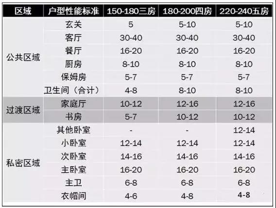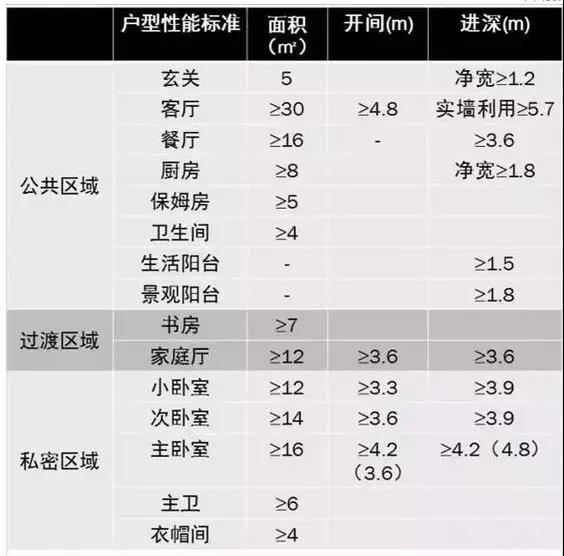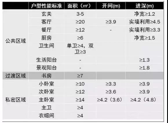 舒適型戶型各功能房間指標小結(套內面積):
