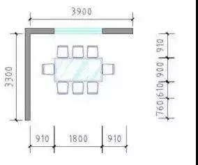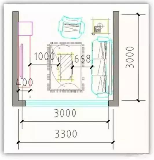 (3)同時需考慮視覺效果,目前市場電視觀看視覺為屏幕對角線3倍,以普通40英寸電視為例,合理視距為3000mm,除去沙發(fā)及電視與墻距離,凈開間尺寸在3300mm。