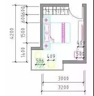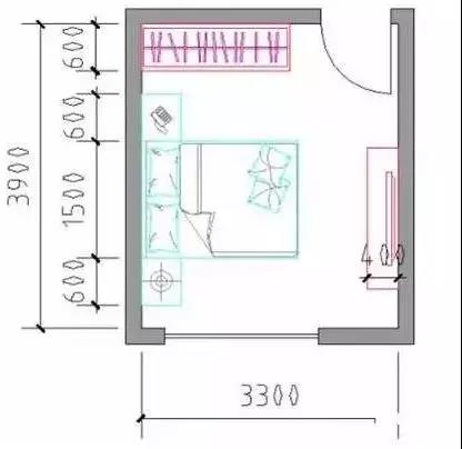 進深:床寬1500mm+床頭柜1200mm+衣櫥600m,尺寸≥3300m