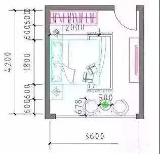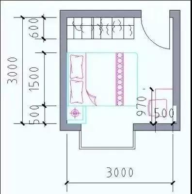 凈寬:床長度2000mm+臥室門1000mm,開間≥3000mm;