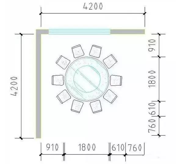享受型餐廳一般設計供10人以上餐桌,某些戶型會有將早餐廳結合廚房設計,根據(jù)人的活動空間及餐桌擺放,靠墻利用在4000mm以上,保證通行暢通。