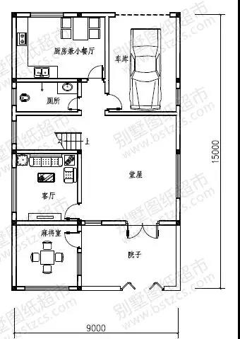 一 層: 院子、麻將室、堂屋、客廳、廚房兼餐廳、衛(wèi)生間、車(chē)庫(kù)