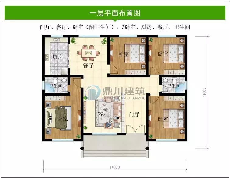 一 層:門廳、客廳、臥室(附衛(wèi)生間)、3臥室、廚房、餐廳、衛(wèi)生間