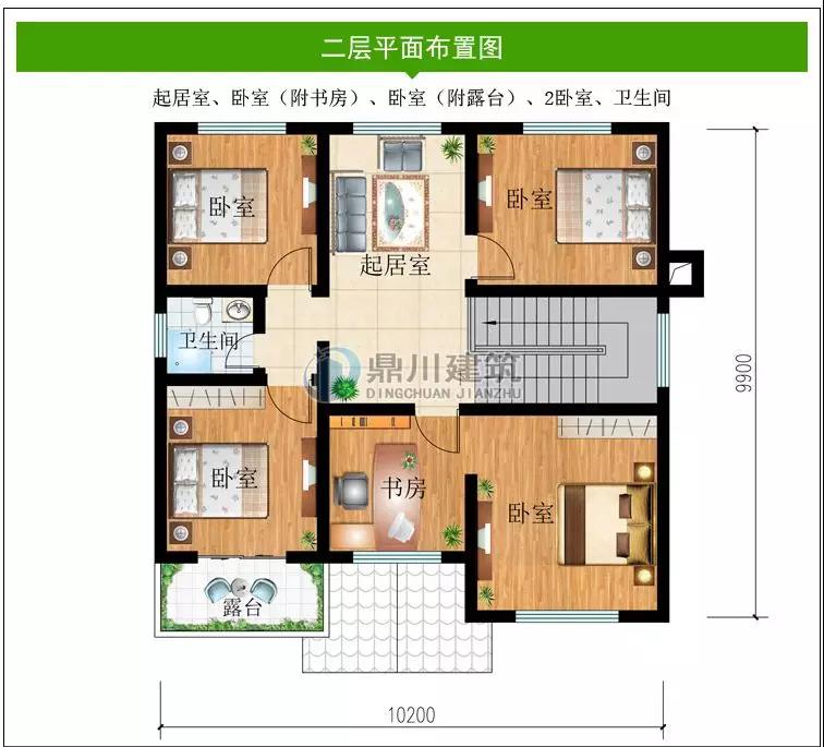 二 層:娛樂室、臥室(附露臺)、2臥室、書房、衛(wèi)生間、露臺