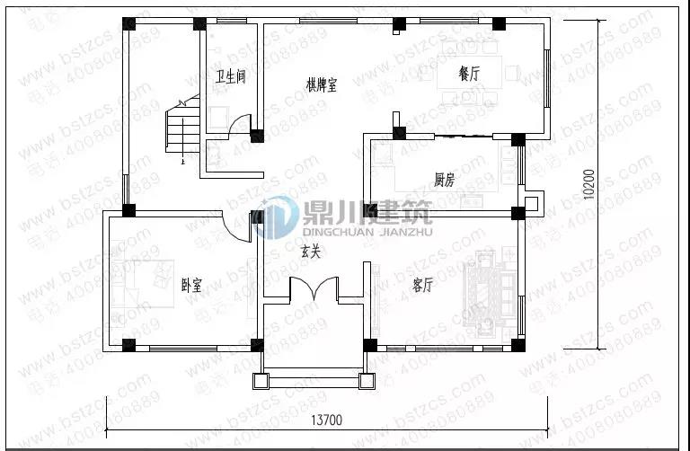 一 層:玄關(guān)、客廳、臥室、棋牌室、廚房、餐廳、衛(wèi)生間