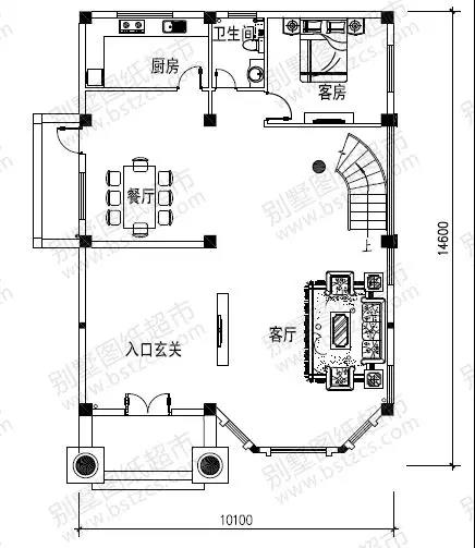 一 層:入口玄關(guān)、客廳、餐廳、廚房、客房、衛(wèi)生間