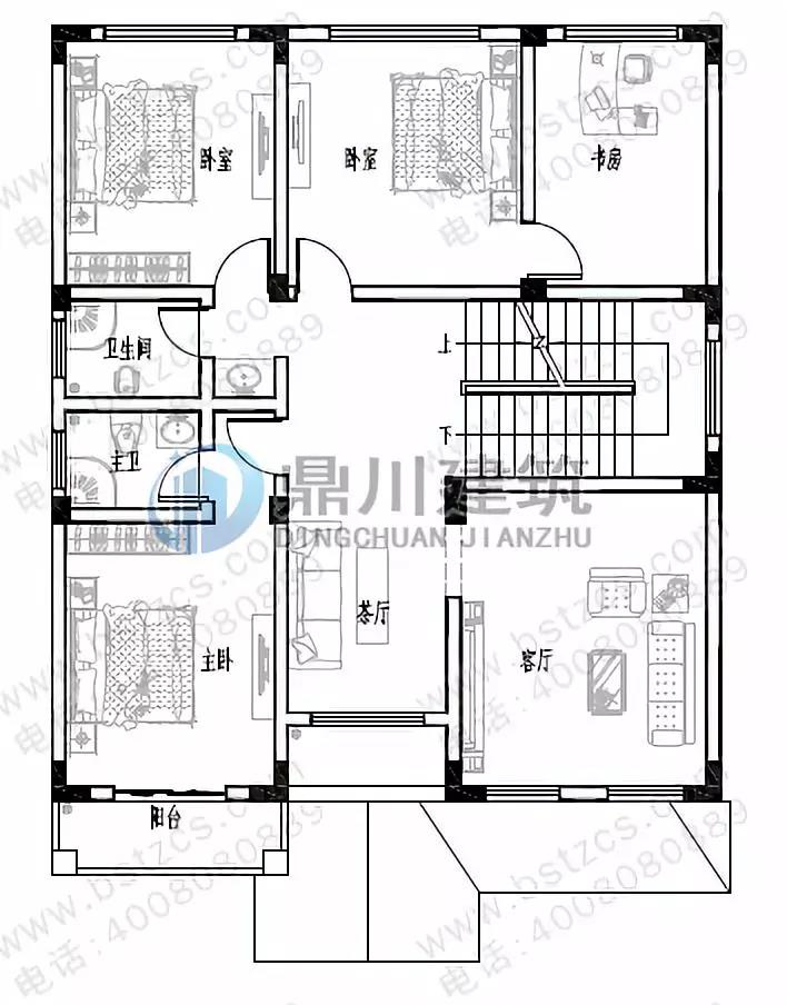 二 層:客廳、3臥室、書房、衛(wèi)生間、陽臺