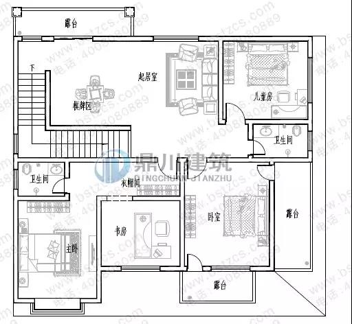 二 層: 起居室(附陽臺)、臥室(附衣帽間,書房,衛(wèi)生間)、臥室(附2露臺)、臥室、衛(wèi)生間
