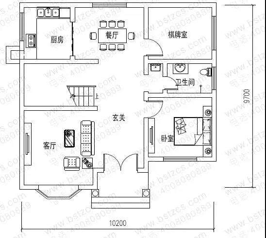 一 層:玄關(guān)、客廳、臥室、棋牌室、廚房、餐廳、衛(wèi)生間