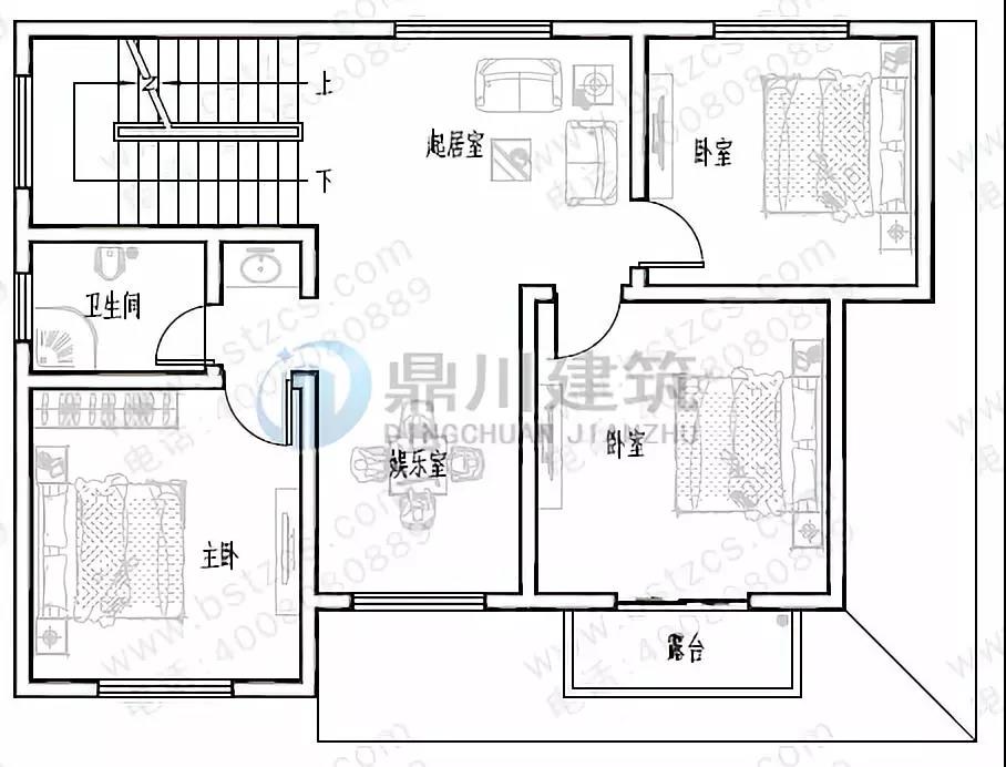 二 層:起居室、娛樂室、臥室(附陽臺)、臥室、衛(wèi)生間、露臺