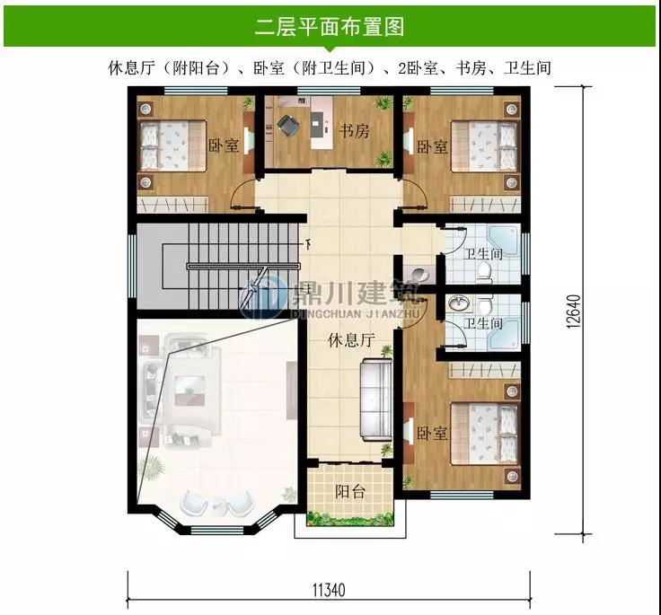 二 層:休息區(qū)(附陽(yáng)臺(tái))、臥室(附衛(wèi)生間)、2臥室、書房、衛(wèi)生間