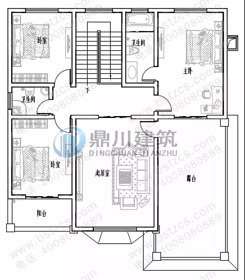 二 層:客廳(附陽(yáng)臺(tái))、主臥(附衛(wèi)生間)、3臥室、衛(wèi)生間