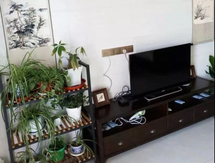 電視背景墻依舊沒有做很多裝飾,主要以軟裝為主,兩幅精美的字畫和盆栽架瞬間提升整間房子的品味。