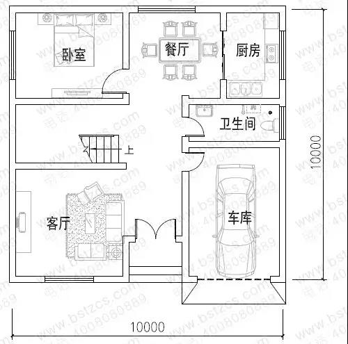 一 層: 客廳、臥室、廚房、餐廳、衛(wèi)生間、車庫