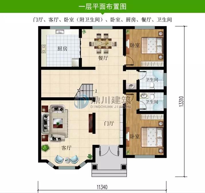 一 層: 堂屋、客廳、2臥室、廚房、餐廳、衛(wèi)生間