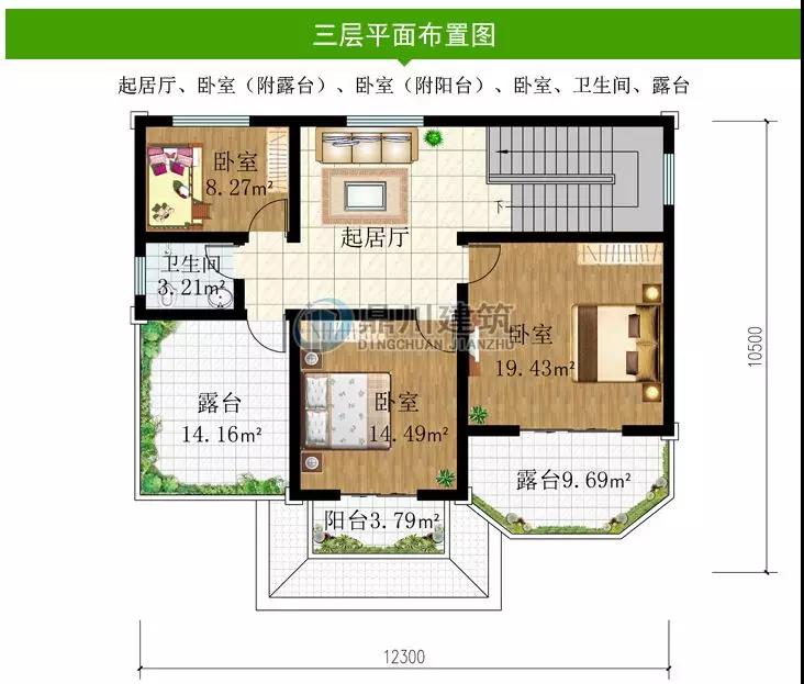 三層設(shè)計(jì)功能:起居廳、臥室(附露臺(tái))、臥室(附陽臺(tái))、臥室、衛(wèi)生間、露臺(tái)。