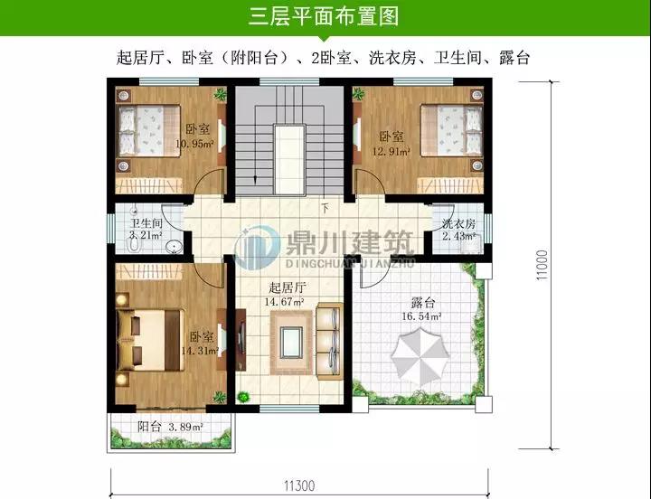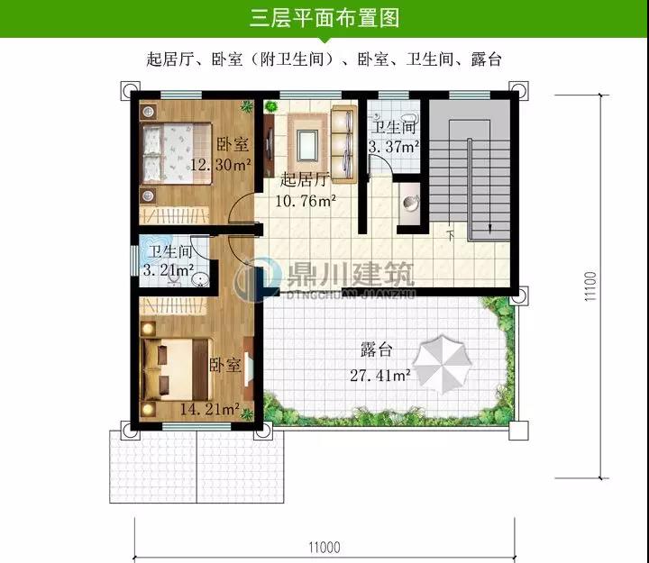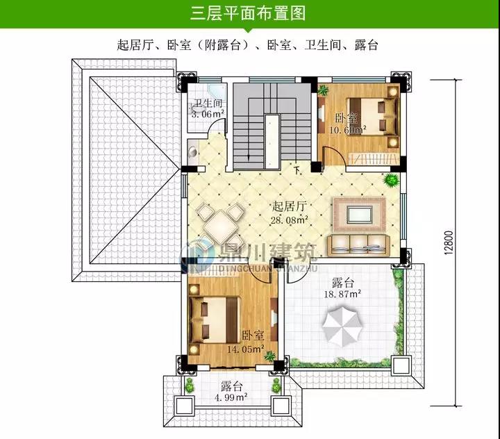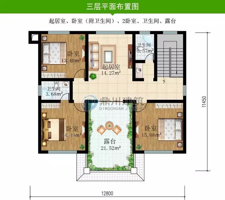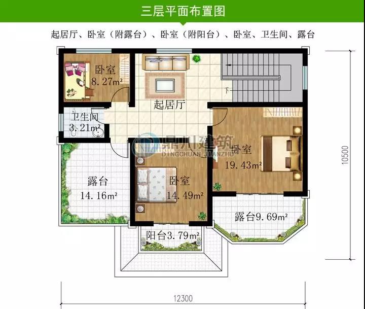 三 層: 起居廳、臥室(附衛(wèi)生間)、臥室、衛(wèi)生間、露臺
