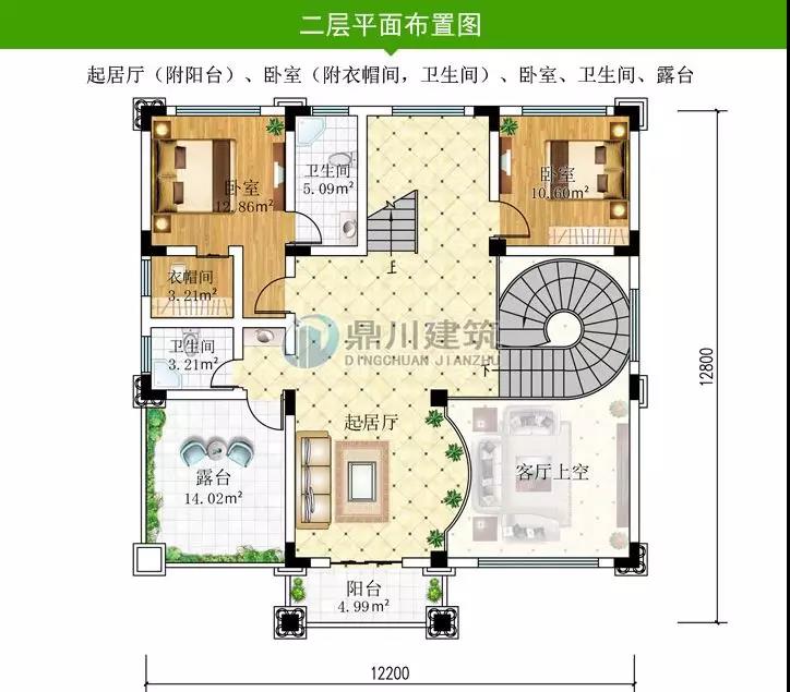 二 層: 起居廳(附陽臺)、臥室(附衣帽間,衛(wèi)生間)、臥室、衛(wèi)生間、露臺