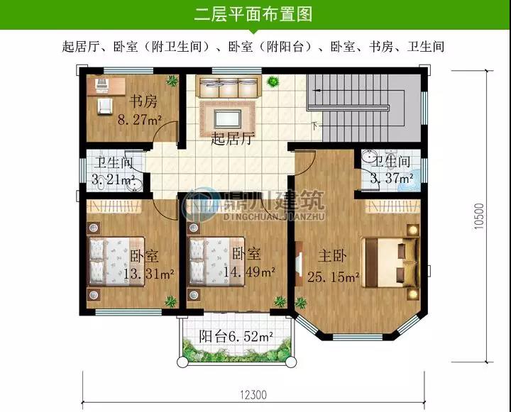 二 層: 起居室(附陽臺)、臥室(附衛(wèi)生間)、3臥室、衛(wèi)生間