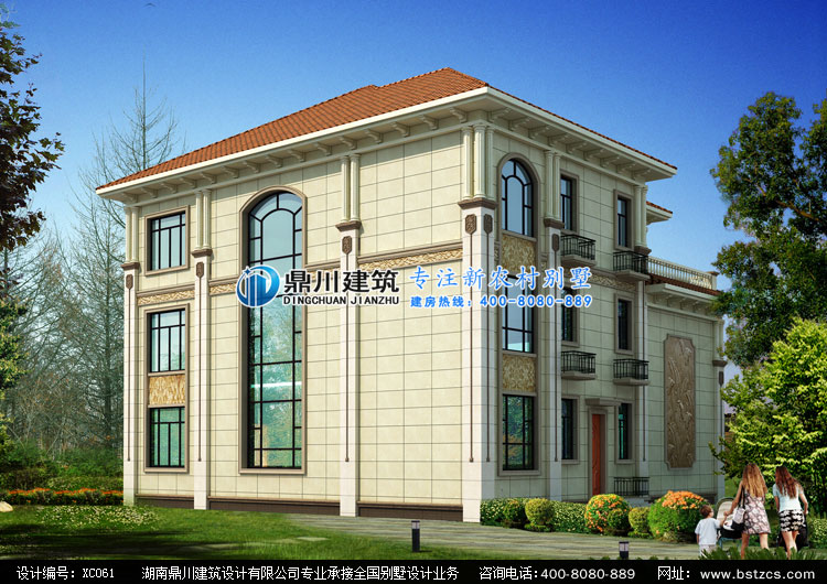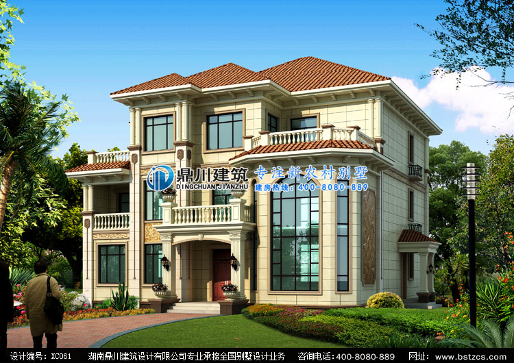 XC061歐式三層帶露臺別墅設計圖紙外觀效果圖,鼎川建筑三層別墅私人定制設計