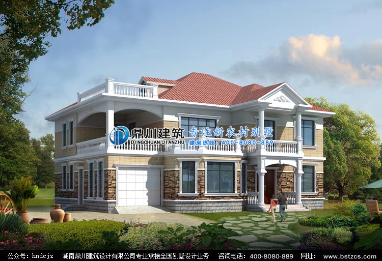 > 設(shè)計(jì)案例 > E0203二層帶車(chē)庫(kù)露臺(tái)別墅圖紙?jiān)O(shè)計(jì)效果圖,鼎川建筑二層別墅設(shè)計(jì)
