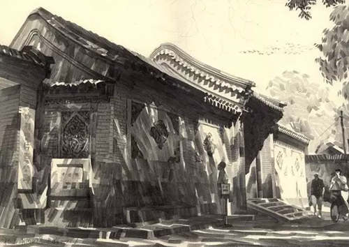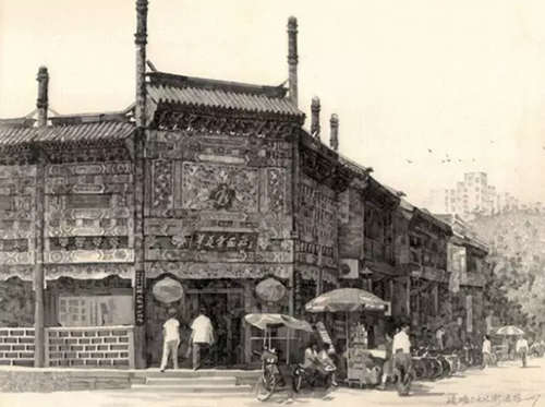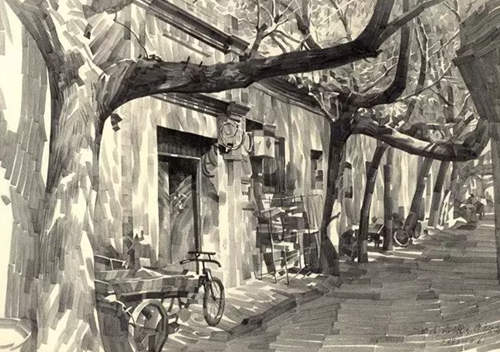 他選用寬線條鉛筆特有的筆觸來表現(xiàn)歷史的遺存,從他筆下的門樓、房舍、街景等日常景物中你會發(fā)現(xiàn)平凡生活的詩意、濃得化不開的人情味,還會體會到濃厚的歷史文化感。