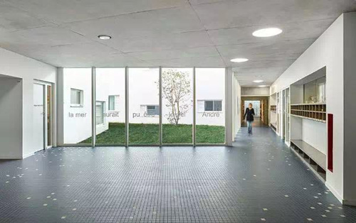 學(xué)校的一層是一個(gè)幼兒園和一個(gè)學(xué)齡前兒童的活動(dòng)場(chǎng)地,其他兩層是小學(xué),操場(chǎng)位于幼兒園的屋頂。較大一點(diǎn)的兒童可以直接從屋頂操場(chǎng)到達(dá)地面,不用穿過(guò)幼兒園區(qū)域。