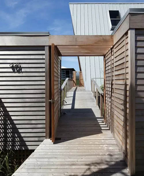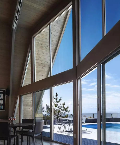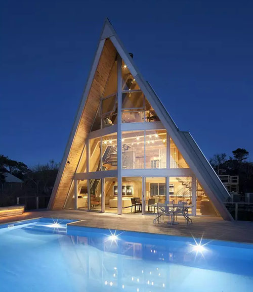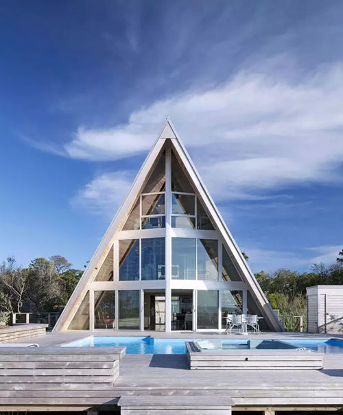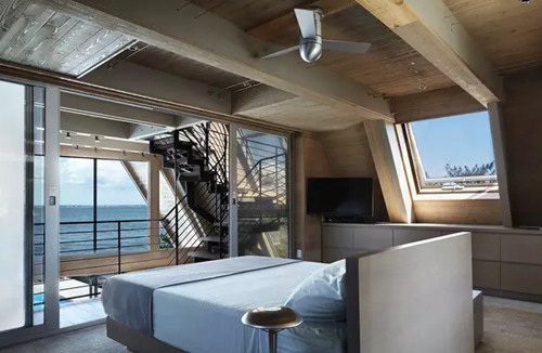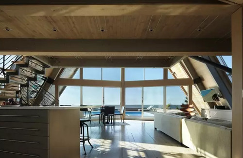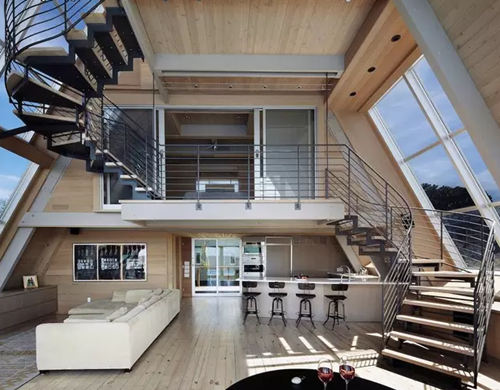 這棟別墅是在一個(gè)舊的三角型斜頂型老房子的基礎(chǔ)上改造完成,經(jīng)過(guò)精心的設(shè)計(jì)和施工,賦予了現(xiàn)代建筑元素和功能,房子外表用金屬鋁板包裹,朝海的一面做了大面積的玻璃幕墻,很難再讓人看出這是棟舊建筑。 房子內(nèi)部的布局也非常有特點(diǎn),房子共有三層,由一部旋轉(zhuǎn)樓梯連接,越向上面積越小,客廳做成了中空,欣賞海景時(shí)可以看到更多藍(lán)天,同時(shí)每個(gè)房間都開(kāi)了斜窗,保證了陽(yáng)光的充足。