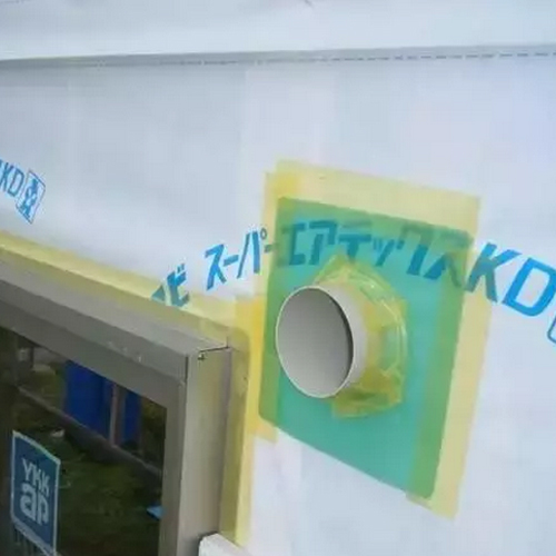 ▼空調管道位置,同樣用黃色丙烯酸防水膠帶對其進行密封處理。