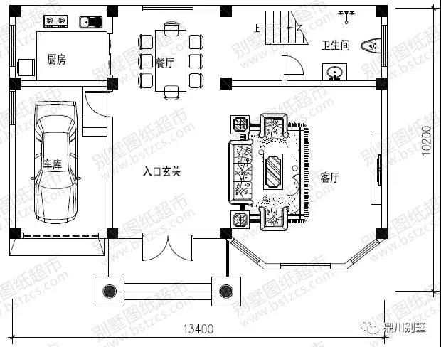 一 層:入口玄關、客廳、廚房、餐廳、衛(wèi)生間、車庫