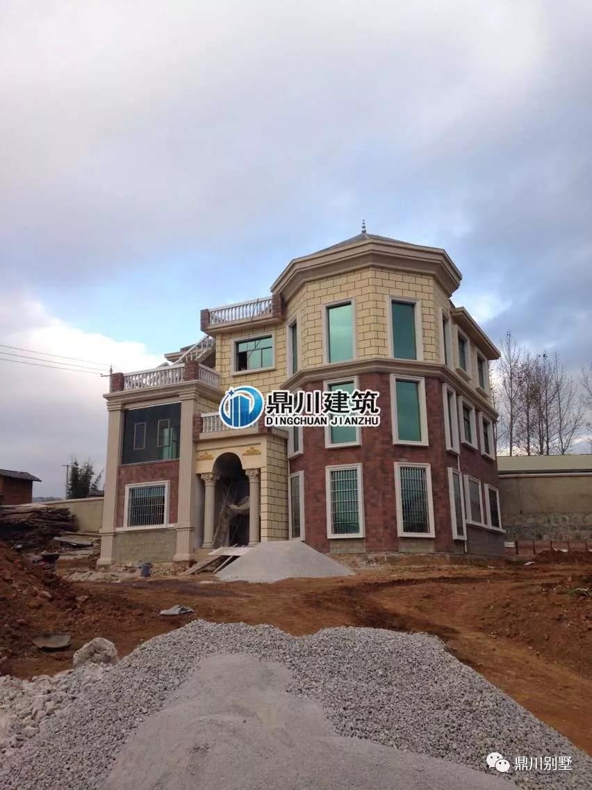 此款房子顏色搭配得非常漂亮,和周圍的山水融為一體,特別的突出、秀美。紅白墻磚相間,立體又不單調,時尚而獨具美感,時尚的造型是整個房子的亮點。藍色的玻璃又和藍天上下呼應。自成一體。在白云下熠熠生輝。說是村中的豪宅也不為過!