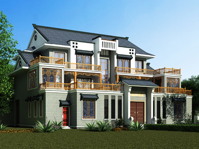 GWK007三層中式別墅設(shè)計(jì)圖紙外觀效果圖,中式三層農(nóng)村自建