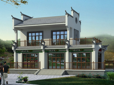 L0189二層帶陽(yáng)臺(tái)中式自建房屋設(shè)計(jì)圖紙效果圖,二層徽派別墅