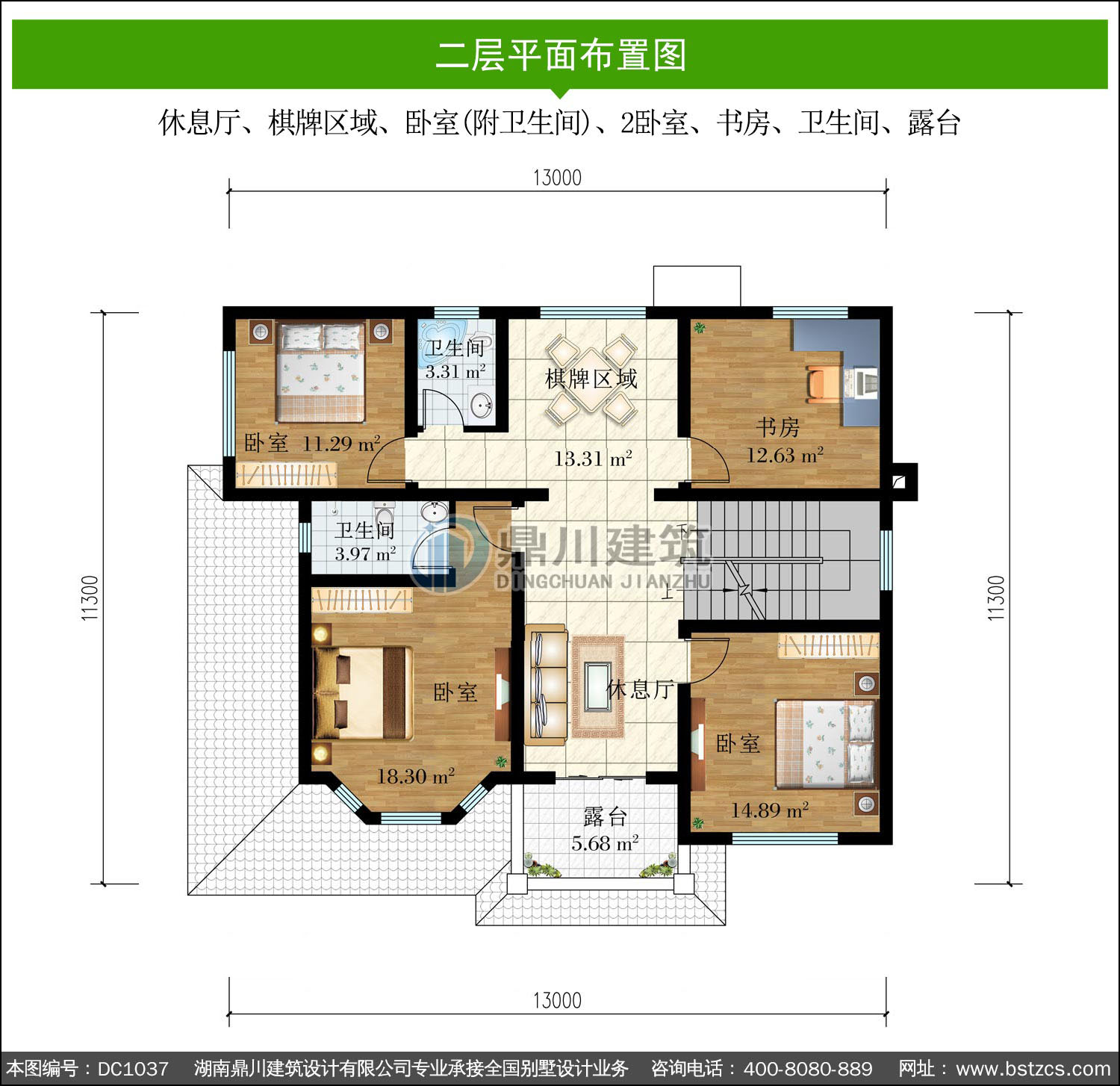 二 層: 休息廳、棋牌區(qū)域、臥室(附衛(wèi)生間)、2臥室、書房、衛(wèi)生間、露臺